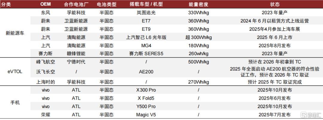 半固態電池具備更高安全性、高能量密度、長循環等優勢,同時半固態電池的生產工藝與現有液態鋰電池產線高度兼容、成本相對可控,在新能源汽車、儲能、低空經濟和消費電子等領域加快進入商業化量產階段。展望2026年,我們認為半固態電池將在eVTOL及消費電子等低成本敏感領域持續實現規模化量產,推動半固態電池規模化降本,然后進一步打開其在動力及儲能領域的應用空間。