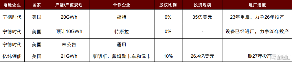 寧德時代:推出LRS模式。針對美國等貿易壁壘較高的市場,公司推出技術授權模式(LRS,License、Royalty、Service),寧德時代負責全套知識產權輸出,包括建設電池產線、搭建供應鏈、調試產線設備和管理製造流程,不佔股份,收取專利授權費和服務費;而工廠資本開支則全部由車企承擔,其對工廠具有100%的產權。LRS模式可實現輕資產運行,降低資本開支並可較好避免關税等潛在風險。目前公司已與福特、通用和特斯拉展開合作,推動公司美國市場業務發展。