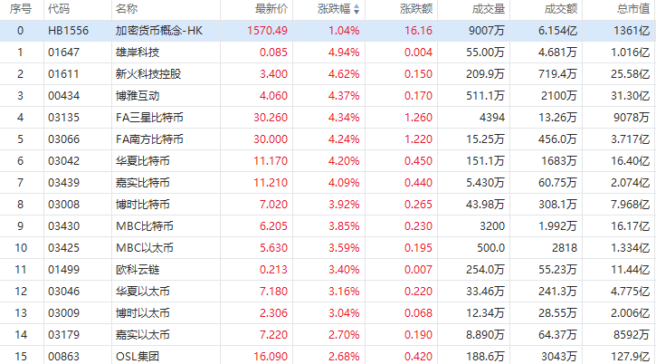港股加密貨幣概念股走高,截至發稿,新火科技控股、博雅互動、華夏比特幣漲超4%,OSL集團漲超2%。