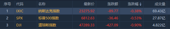 截至收盤,標普500指數跌0.53%,報6812.63點;納斯達克綜合指數跌0.38%,報23275.92點;道瓊斯工業平均指數跌0.9%,報47289.33點。