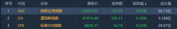 截至收盤,標普500指數漲0.25%,報6829.37點;納斯達克綜合指數漲0.59%,報23413.67點;道瓊斯工業平均指數漲0.39%,報47474.46點。