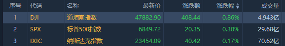 截至收盤,標普500指數漲0.3%,報6849.72點;納斯達克綜合指數漲0.17%,報23454.09點;道瓊斯工業平均指數漲0.86%,報47882.9點。