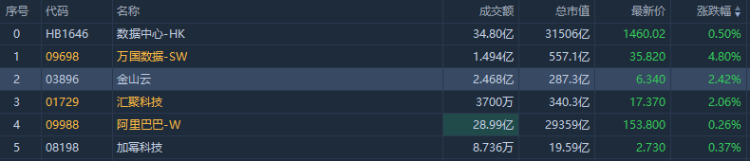 數據中心股早盤走高,截至發稿,萬國數據-SW漲超5%,金山雲漲超3%,匯聚科技漲超2%。
