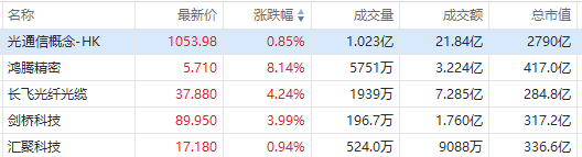 光通信概念股再度上揚,截至發稿,鴻騰精密(06088)漲8.14%,報5.71港元;長飛光纖光纜(06869)漲4.24%,報37.88港元;劍橋科技(06166)漲3.99%,報89.95港元;匯聚科技(01729)漲0.94%,報17.18港元。