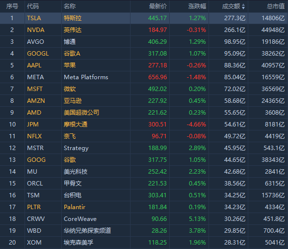 第12名Strategy收高2.89%,成交45.95億美元。摩根大通指出,Strategy的股價已充分反映被MSCI等主流指數剔除的風險,指數編制公司MSCI即將公佈的決定反而可能成為該股股價的上漲催化劑,即使該股被剔除仍會引發被動資金外流。