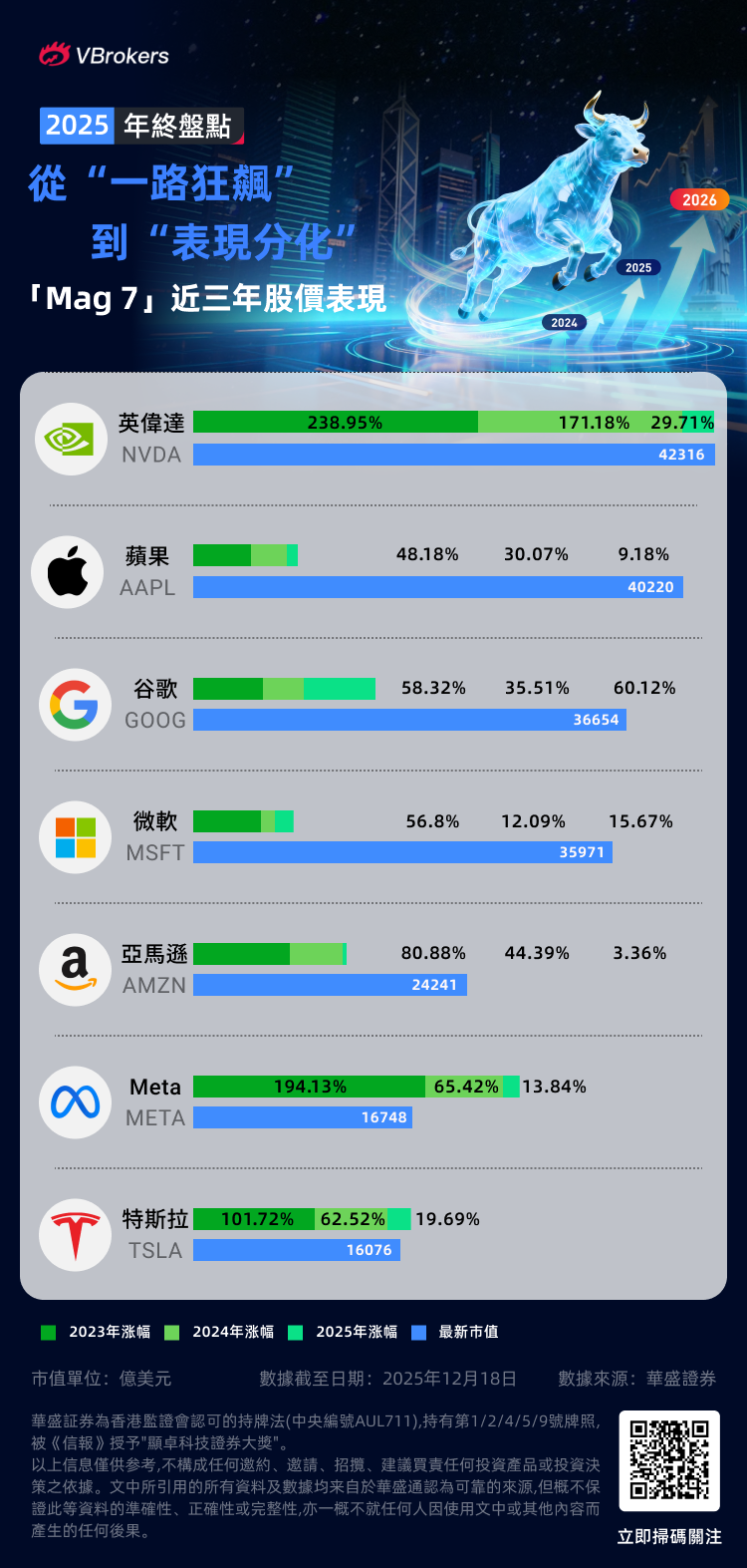 總結來看,這三年Mag 7的表現,從「一路狂飆」走向「格局分化」,在一個不再為口號買單的市場里,2026年究竟誰能把AI變成真金白銀,誰又會因為只會講故事或靠歷史底氣而慢慢掉隊?「強者恆強」還是「王朝更替」,答案也許很快就會揭曉。