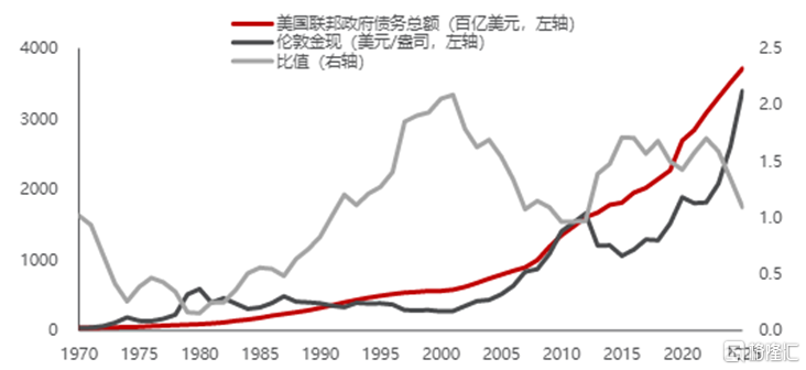 所以看到最好的擬合曲線是美債和黃金總價值量的比較。在過去80年的周期中,這一擬合關係仍是非常穩定的。所以樂觀者甚至認為,如果全球資產從美債中繼續外溢,黃金可以漲到6000美元。