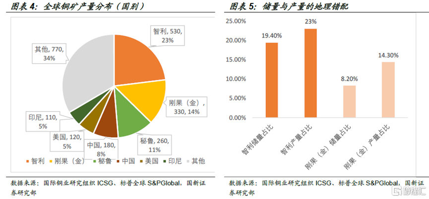 作為核心的大宗工業金屬,銅的全球地理錯配現象也非常嚴重。全球近10億噸儲量中;儲量高度集中,智利/祕魯/剛果(金)重要性高,中國雖然需求高達50%以上,但儲量佔比僅僅只有4%。