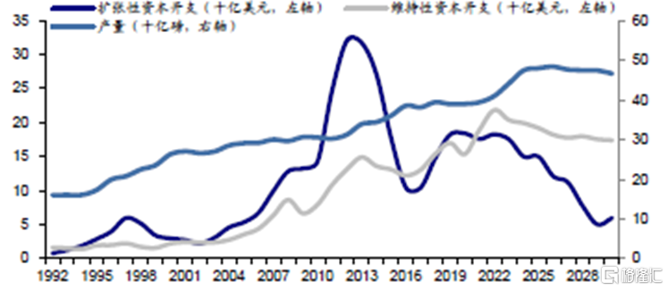 ·資本開支不足(一半左右還為維護性),導致新增產能有限。2010 - 2020 年全球資源類資本開支持續低迷,儘管 2020 年后有所回升,但新增產能釋放滯后,預計供給高峰將出現在 2028年后,且增產幅度有限。
