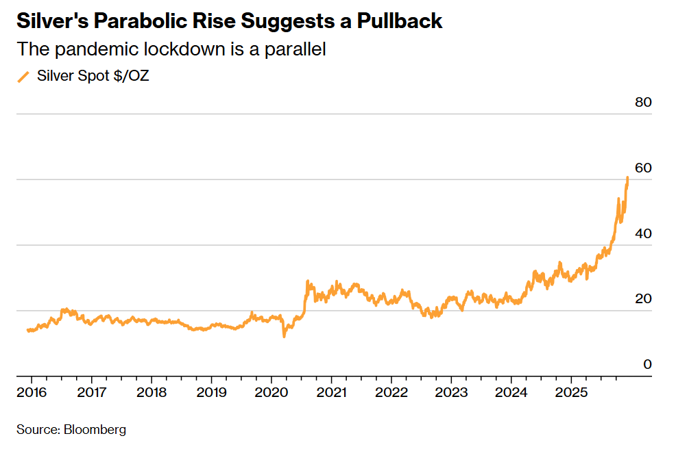 白銀價格從2020年3月疫情封鎖前的低點翻倍至當年8月的高點,隨后在去年年初前持續走低。特朗普的政策(尤其是關税政策)促使其價格再次翻倍。