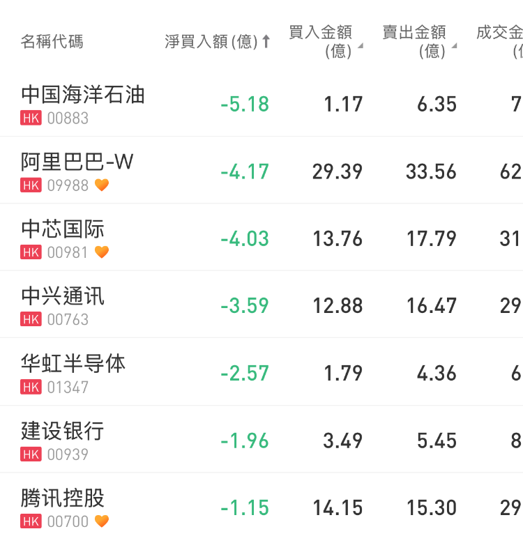 中國海洋石油、阿里巴巴、中芯國際分別遭淨賣出5.18億港元、4.17億港元、4.03億港元。