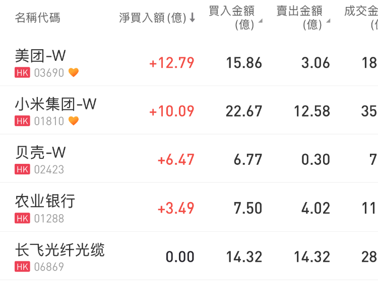 美團-W、小米集團-W、貝殼-W分別獲淨買入12.79億港元、10.09億港元、6.47億港元;