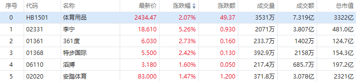 體育用品股集體走高,截至發稿,李寧漲超5%,361度漲近3%,特步國際漲超2%。