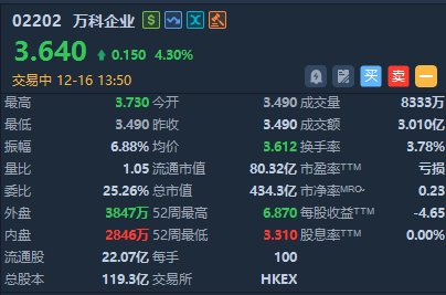 內房股部分午后逆市拉昇,萬科企業漲近5%,融創中國漲超2%,碧桂園漲超1%,中國金茂漲近1%。