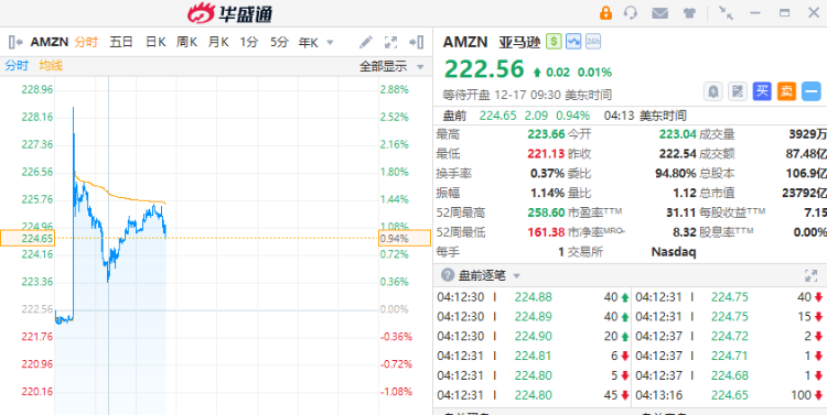 華盛資訊12月17日訊,美股三大期指盤前小幅走高,亞馬遜漲超1%,OpenAI據悉洽談從亞馬遜融資100億美元。