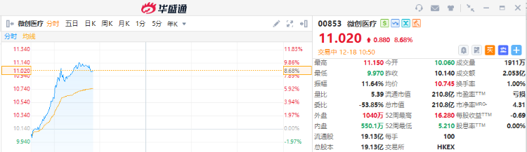 微創醫療漲超8%,截至發稿漲8.68%,報11.02港元,成交額2.053億港元。