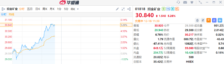 招金礦業盤中漲超5%,截至發稿,漲5.26%,報30.84港元,成交額2.81億港元。