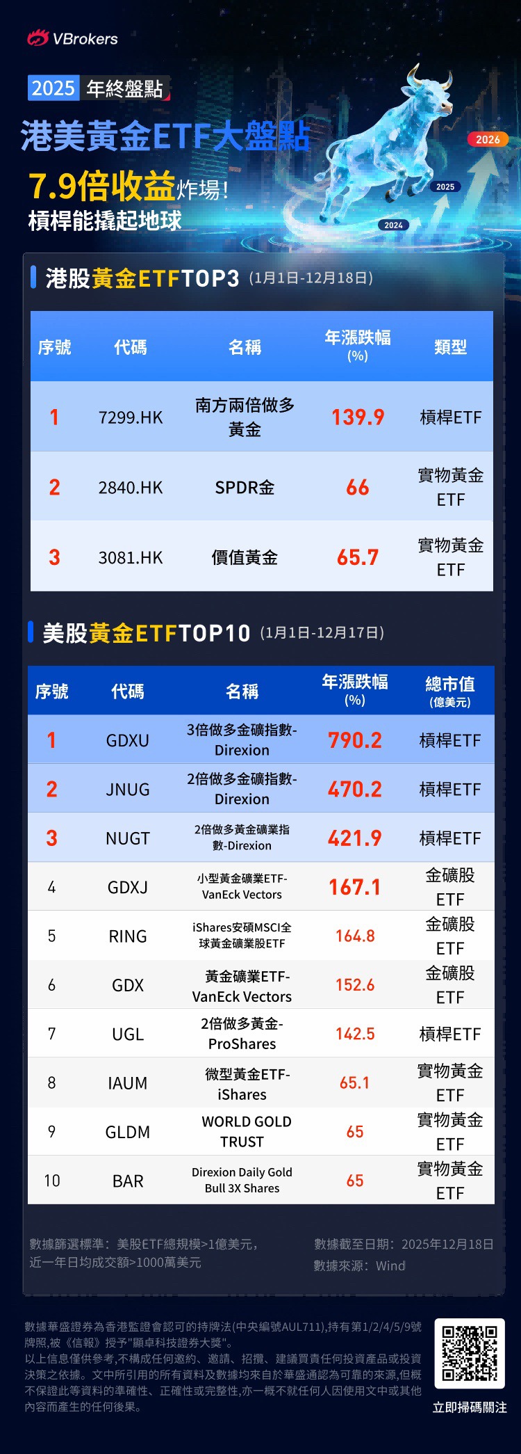 黃金ETF也是投資黃金的另一種方式。港股市場上,黃金ETF種類較少,其中南方兩倍做多黃金的槓桿ETF錄得近140%漲幅;美股市場上黃金相關ETF較多,整體來看收益排序:槓桿金礦股ETF>金礦股ETF>槓桿現貨黃金ETF>實物黃金ETF,彈性最大的美股市場TOP1 是三倍做多黃金礦業ETF,漲幅高達790.2%。
