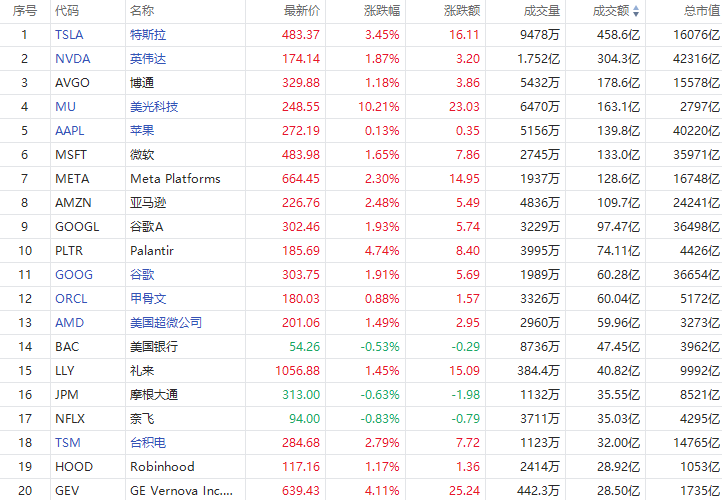 第4名美光收高10.21%,成交161.41億美元。該公司的財報顯示其存儲芯片需求強勁,且遠超市場預期。