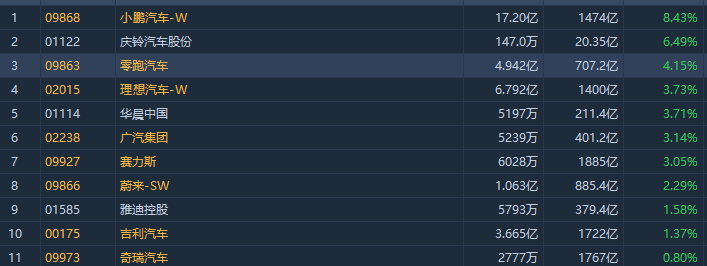 汽車股多數上漲,小鵬汽車漲幅擴大至8%,零跑汽車漲超4%,理想汽車-W、廣汽集團漲超3%,蔚來-W、賽力斯漲超2%。