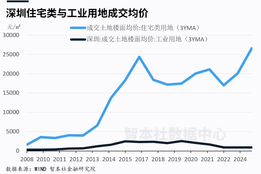 從2008年到2024年,深圳住宅用地價格大幅度上漲,翻了17倍,其中2013年到2016年間上漲明顯;工業用地價格上漲幅度較小,其中2015年到2024年還下降了65%,即當前深圳工業用地比十年前還便宜;從2013年開始,住宅用地價格與工業用地價格差距迅速拉大,二者差距從4.8倍擴大到2024年的52倍。