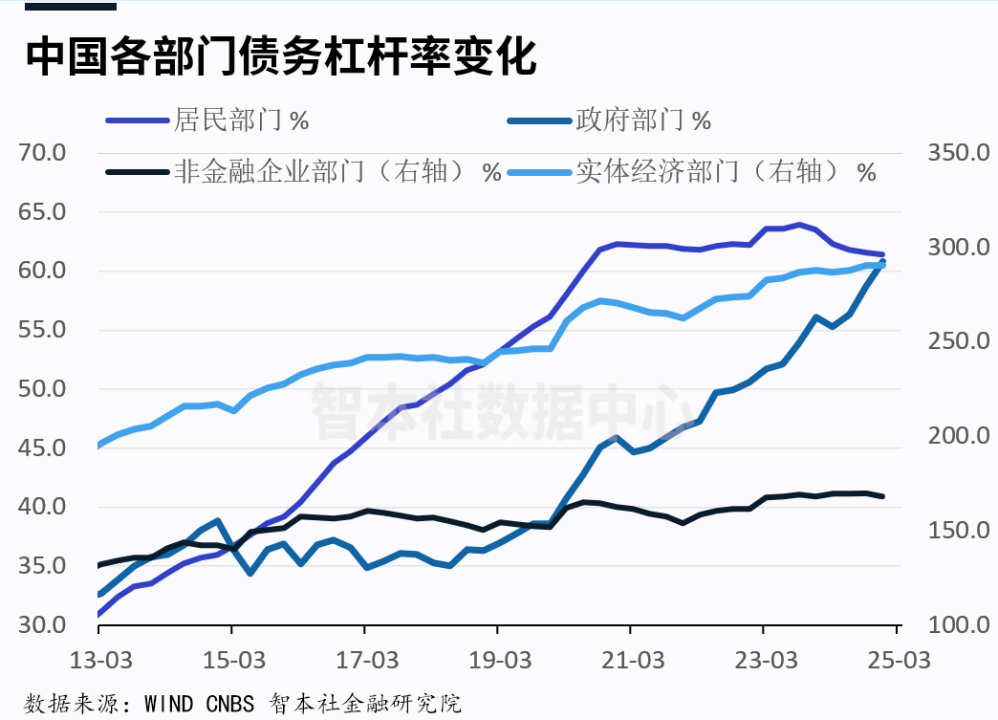 數據顯示,住户部門貸款余額佔信貸余額比重為32%、佔社融存量比重為20%,非金融企業貸款余額佔信貸余額比重為68%、佔社融存量比重為42%。非金融企業貸款余額、政府債務余額合計佔社融存量比重達到63%,其中絕大部分資本都配置到投資領域和供給端。