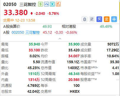 三花智控跌超5%,今日迎基石解禁,全年淨利最高預增50%。