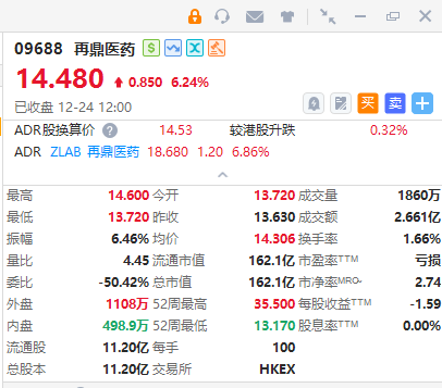 華盛資訊12月24日訊,熱門中概股走勢分化,再鼎醫藥大漲超6%,重磅抗精神分裂症新葯凱捷樂在中國獲批上市;
