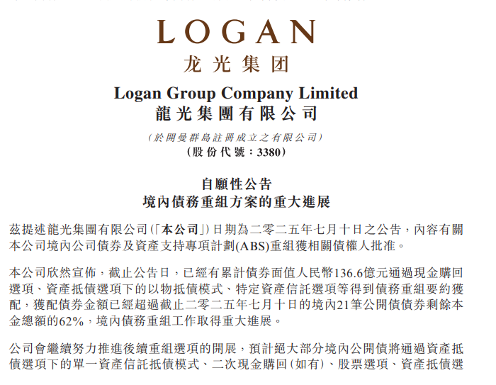 12月30日,龍光集團(03380.HK)發佈公告,截至公告日,已經有累計債券面值人民幣136.6億元通過現金購回選項、資產抵債選項下的以物抵債模式、特定資產信託選項等得到債務重組要約獲配,獲配債券金額已經超過截至2025年7月10日的境內21筆公開債債券剩余本金總額的62%,境內債務重組工作取得重大進展。