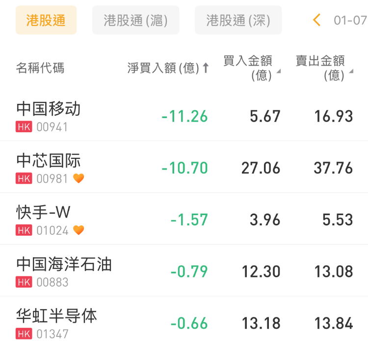 中國移動、中芯國際、快手-W分別遭淨賣出11.26億港元、10.7億港元、1.57億港元。