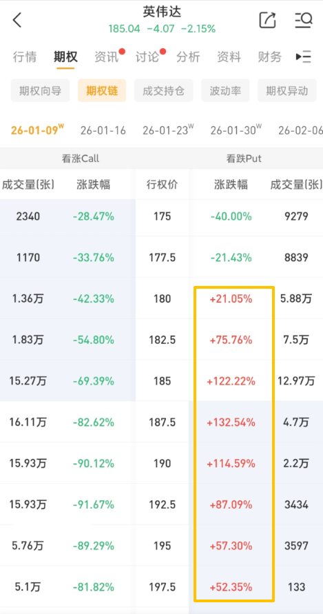 其中一看漲期權(NVDA_260109_C_190.0)交易量達15.93萬張,該合約行權價為190.0美元,行權日在2026-01-09,該張期權跌90.12%