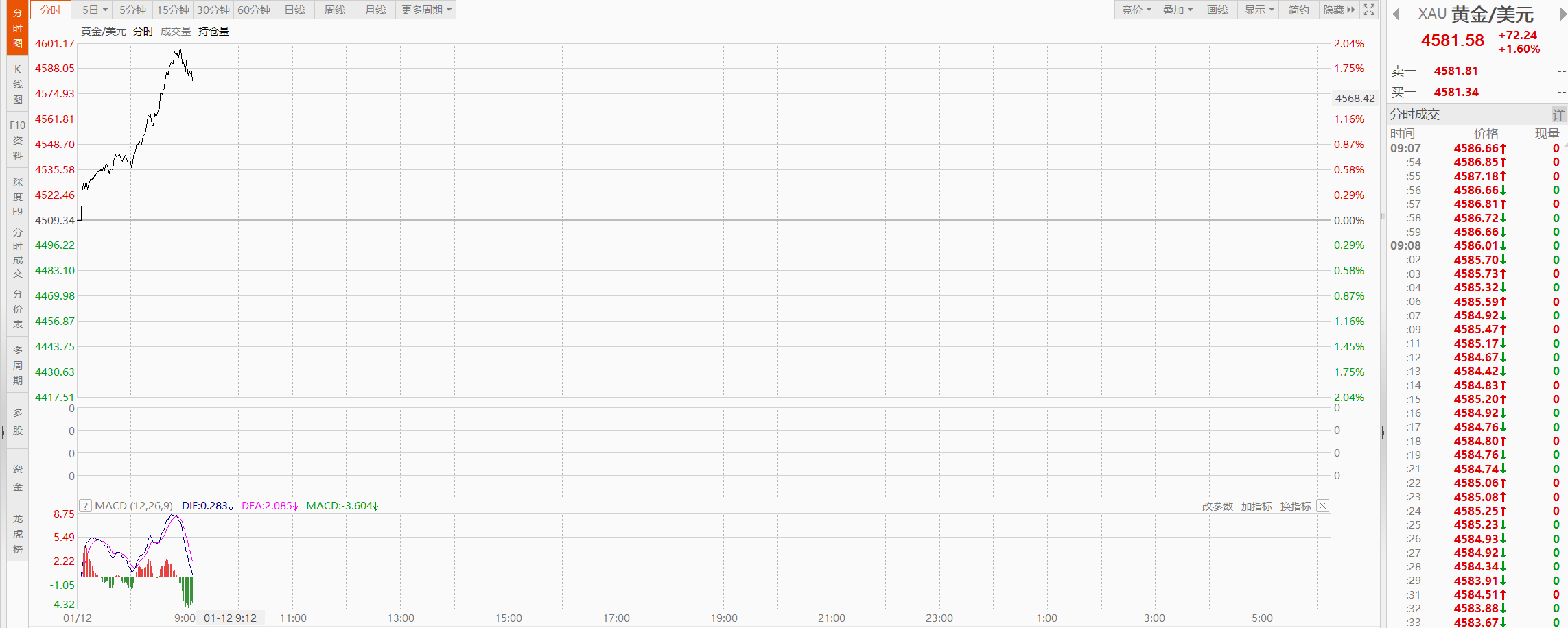 白銀瘋漲同時,黃金現貨也創歷史新高,盤中一度突破4600美元/盎司,日內漲超2%。