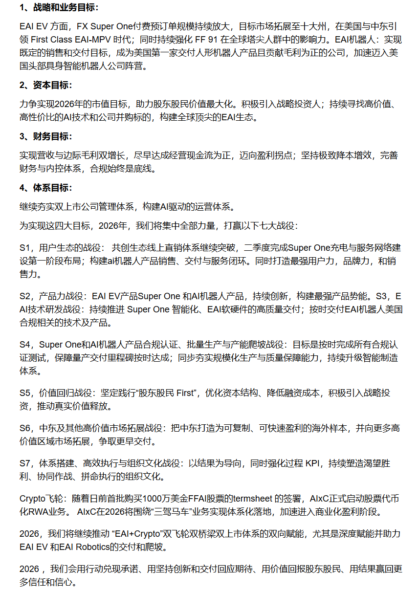 四大內因:第一,這是 FF 自創立之初 AI 基因的自然延展,也是我們十幾年前「汽車機器人」構想的必然升級;第二,複製並升級汽車橋樑模式,在合規前提下,整合全球 EAI 供應鏈,打造高性價比機器人產品,填補美國市場空白;第三,AI機器人業務投入更輕、交付更快,更容易形成經營性正向現金流,反哺造車主業;第四,EAI機器人與 EAI 汽車為FF形成雙擎驅動,在研發、製造、銷售和服務上高度協同,與 FF 的雙飛輪、雙橋樑、雙上市體系形成生態共振,開啟全新的增長曲線。
