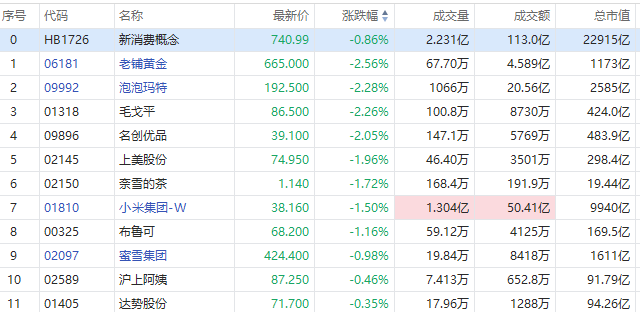 毛戈平,名創優品、老鋪黃金跌超2%,小米集團-W、蜜雪集團、布魯可跌約1%。