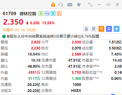 德林控股(01709)大漲近14%,截至發稿,漲13.53%,報2.35港元,成交額3.58億港元。
