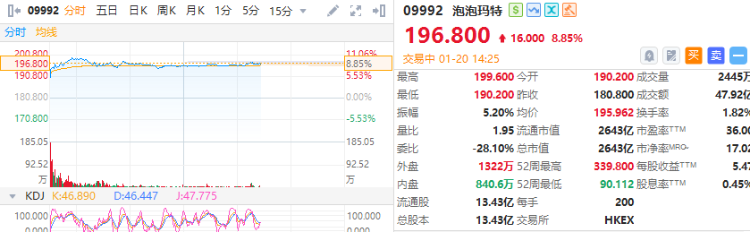 泡瑪上日股價跌至逾8個月低位后,今日早段大幅反彈,曾升逾一成,高見199.6元,重上10天及20天線。