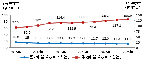 圖2-1 2015—2025年固定電話及移動電話普及率發展情況