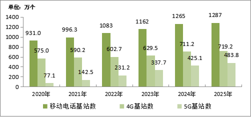 截至2025年底,全國移動電話基站總數達1287萬個,比上年末淨增22.7萬個。其中,4G基站為719.2萬個,比上年末淨增8萬個。5G基站為483.8萬個,比上年末淨增58.8萬個,5G基站佔移動電話基站總數達37.6%,佔比較上年末提升4個百分點。其中,具備5G RedCap接入能力的基站數達206.4萬個,佔5G基站的42.7%。