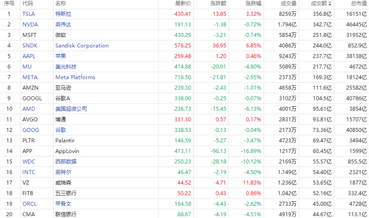 第14名Palantir收跌3.47%,成交68.74億美元。該股本周累計下跌13.6%,在1月份下跌17.5%。日前美股知名科技分析師、韋德布什分析師丹-艾夫斯(Dan Ives)及其團隊最新表示,圍繞格陵蘭島的「紛爭」正導致美國股市疲軟。艾夫斯指出,隨着「避險情緒」衝擊人工智能(AI)概念股,科技股勢必受到衝擊,但他們認為這是一個持有「科技股贏家」的機會。他指出,「如果股市走弱,會買入IVES AI 30指數中的許多股票,包括英偉達、微軟、Palantir、蘋果、谷歌和特斯拉。」