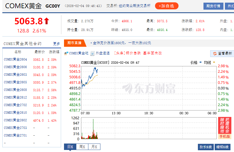 2月4日早盤,現貨黃金開盤直線拉昇,重新站上5000美元/盎司,最新報5039.79美元/盎司,漲近1.9%。