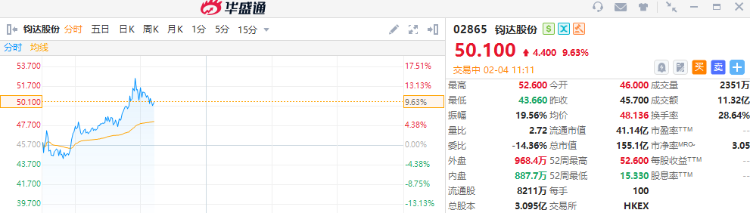 鈞達股份再漲超9%,截至發稿,漲9.63%,報50.1港元,成交額11.32億港元。