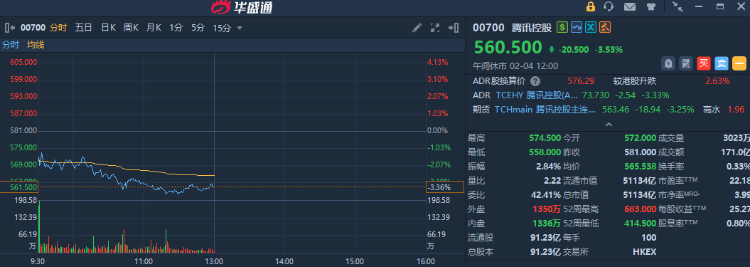 2月4日消息,港股三大指數低開低走。截至午間收盤,恆生指數跌0.41%,報26724.50點,恆生科技指數跌2.2%,國企指數跌0.54%。盤面上,科網股普跌,嗶哩嗶哩跌超4%,騰訊跌超3%,百度、網易、快手、小米、美團、聯想跌超2%;煤炭股走強,飛尚無煙煤漲超33%;應用軟件板塊跌幅居前,聚水潭跌超9%;國恩科技上市首日漲超16%。