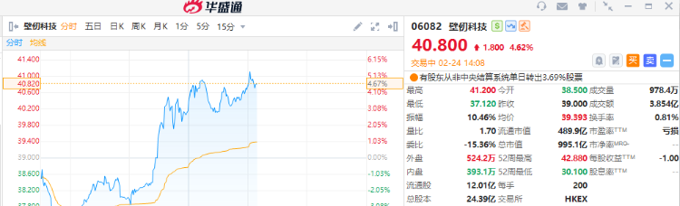 壁仞科技再漲近5%,截至發稿,漲4.62%,報40.8港元,成交額3.854億港元。