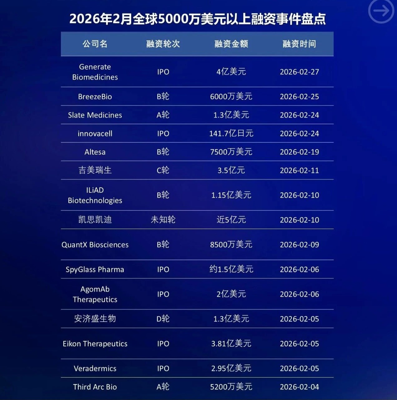 據藥明康德(603259.SH)公眾號消息,根據藥明康德數據庫統計,截至2026年2月27日,2026年2月全球生物醫藥領域共計完成94起融資活動,累計公開披露的融資總額超過了38億美元。其中,有15家專注於開發創新療法的公司單筆融資額突破了5000萬美元大關。這些公司不僅涵蓋了傳統的小分子藥物研發,還涉及多種新分子療法領域。