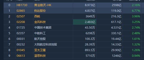 商業航天板塊發力,鈞達股份漲超6%,西鋭漲近4%,金風科技漲超3%,中航科工漲超2%,亞太衞星漲超1%。