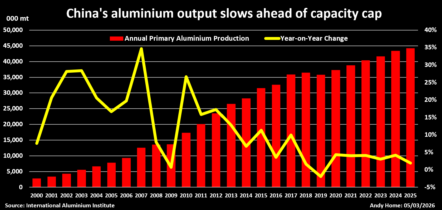 霍爾木茲海峽持續關閉威脅佔非中國供應23%的區域產能,而歷史依賴的中國庫存與彈性產能已顯著削弱:中國鋁產能已逼近4500萬噸年上限,2024年4%增速降至去年2%,12月運行率約4450萬噸(IAI數據)。同時,中國進口原鋁創紀錄達250萬噸,半製成品出口下降近10%(約60萬噸),雙向收緊西方供應。