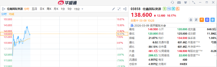佳鑫國際資源逆市漲超10%,高見146.5港元,再創歷史新高。截至發稿,報138.6港元,成交額11.39億港元。