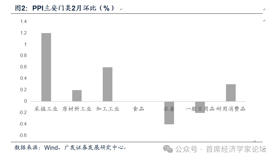 PPI環比0.4%,屬連續第五個月正增長。從大類來看,採掘工業、加工工業、耐用消費品、原材料環比上漲,食品持平,衣着、一般日用品環比下跌。簡單來看,目前還並未形成從上游漲價傳遞至消費品價格普遍好轉的典型通脹。從行業來看,上漲的一是有色系列;二是石油化工系列;三是AI革命帶動下的計算機通信電子行業;四是成本上升、「反內卷」影響下的電氣機械行業。煤炭、非金屬等價格在中東地緣政治升溫以來價格上行較快,但2月數據仍屬環比下行。