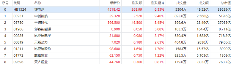 從下圖來看,寧德時代表現較為亮眼,該公司早盤漲超8%,近三個交易日累計漲幅逾16%。