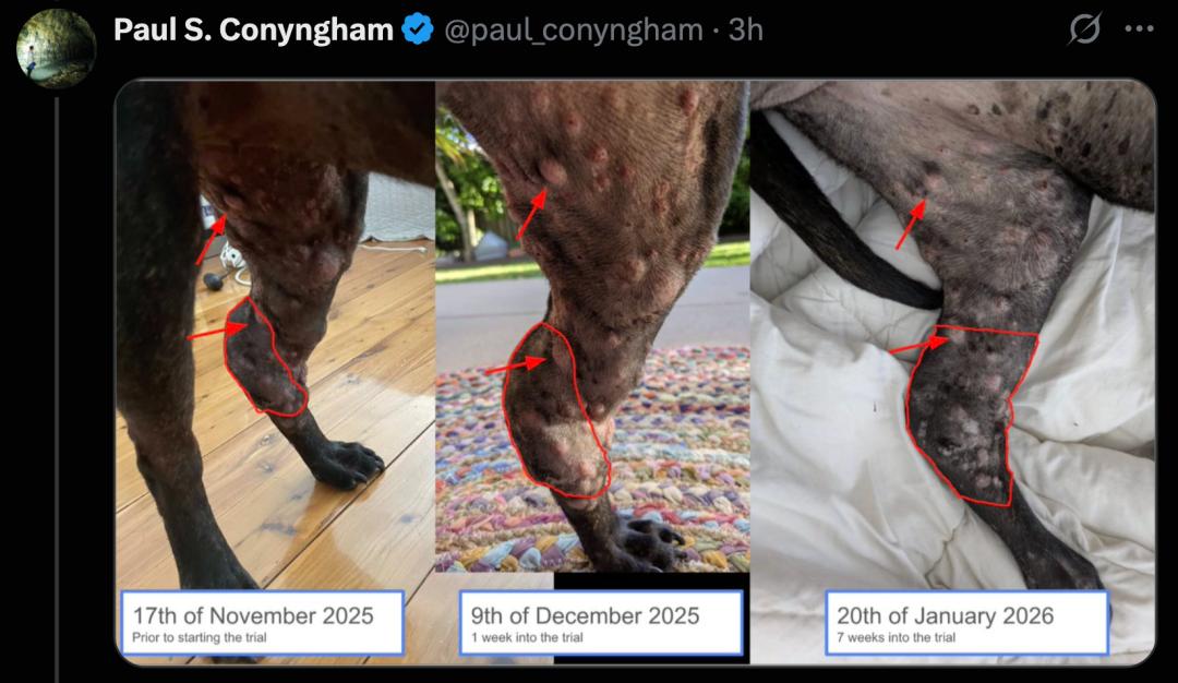 短短數周,Rosie在接受定製的mRNA 癌症疫苗治療后,后腿關節上那個網球大小的腫瘤竟「縮小了一半」!